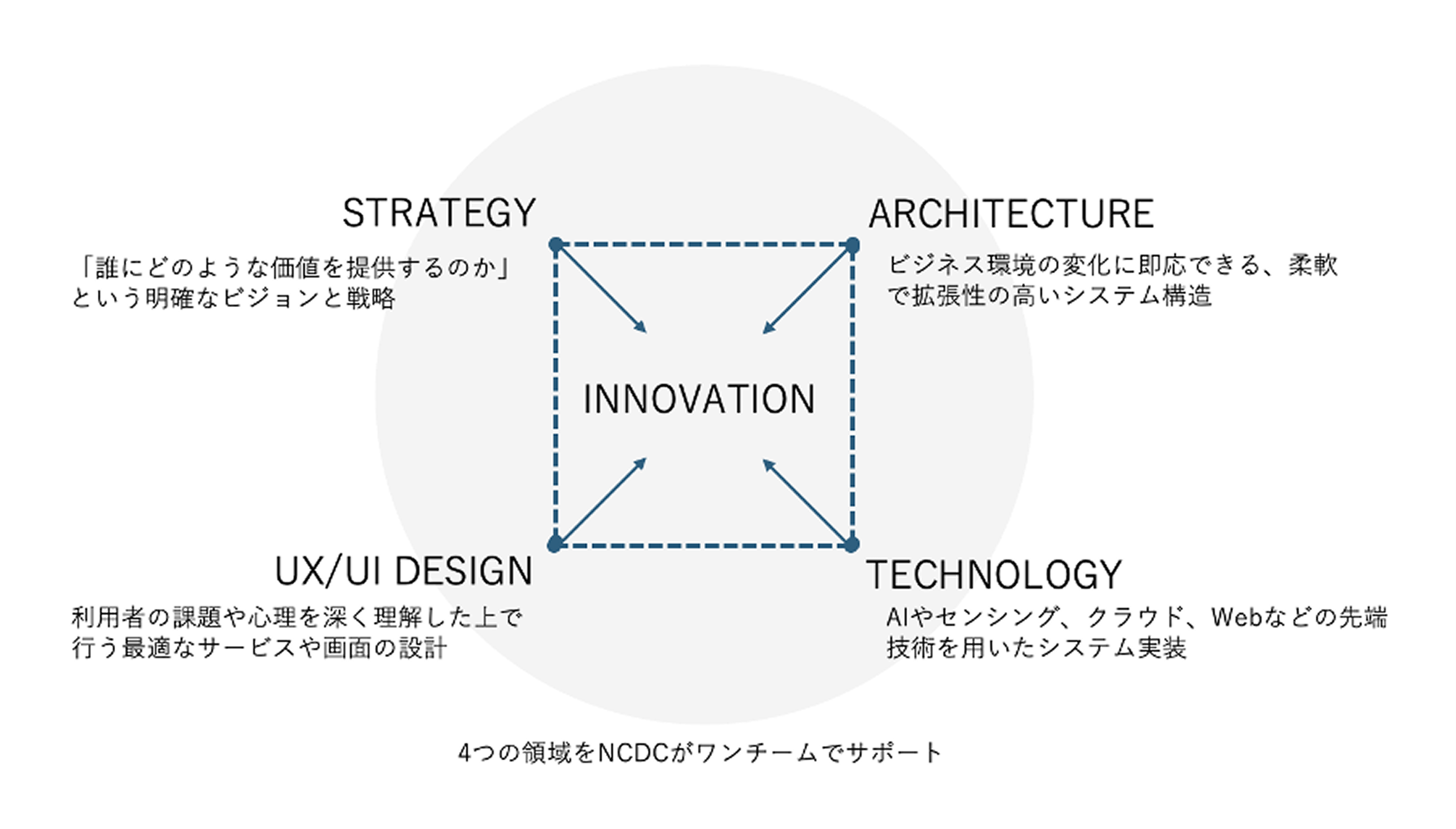 NCDCは、目指すべき事業成果を明確に描く「戦略」、利用者の体験を最大化する「UX/UIデザイン」、ビジョンを具現化する「テクノロジー」、そして変化に柔軟に対応できる「ITアーキテクチャ」のすべてを、分断のない一つのチームとして提供します。