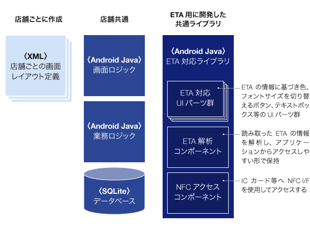 ※ETAとは、Enhanced Terminal Accessibility using cardholder preference interfaceの略でカード等に格納された個人の支援リクエスト情報に合わせて、券売機や、コンピューターなどのユーザーインターフェースが自動的に切り替わる仕組みです。ETAに対応したアプリケーションやシステム、機械が普及する事で、日常生活の多様なシーンで、最適な形でパーソナライズされたインターフェースをスマートデバイス等の機器を通じて受け取る事ができるようになります。ETAの仕組みは高齢者や障害を持った方に向けたサービスを中心に注目されています。