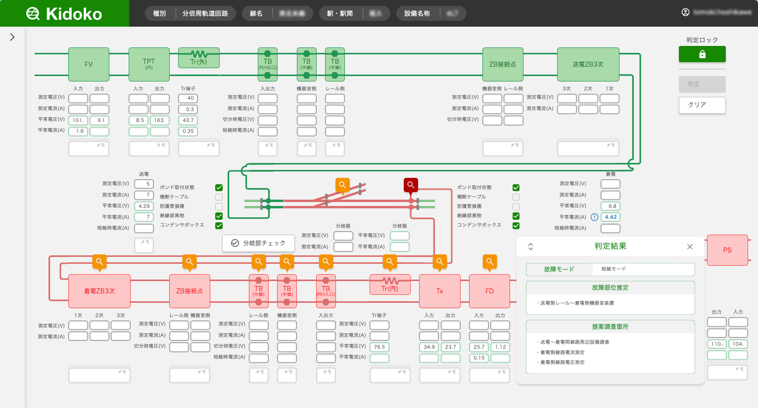- 軌道回路の迅速な可視化:わずかな手順で軌道回路の電気回路図を自動的に作成して画面に表示。現場の実測値や正常/異常の判断を回路図上で可視化