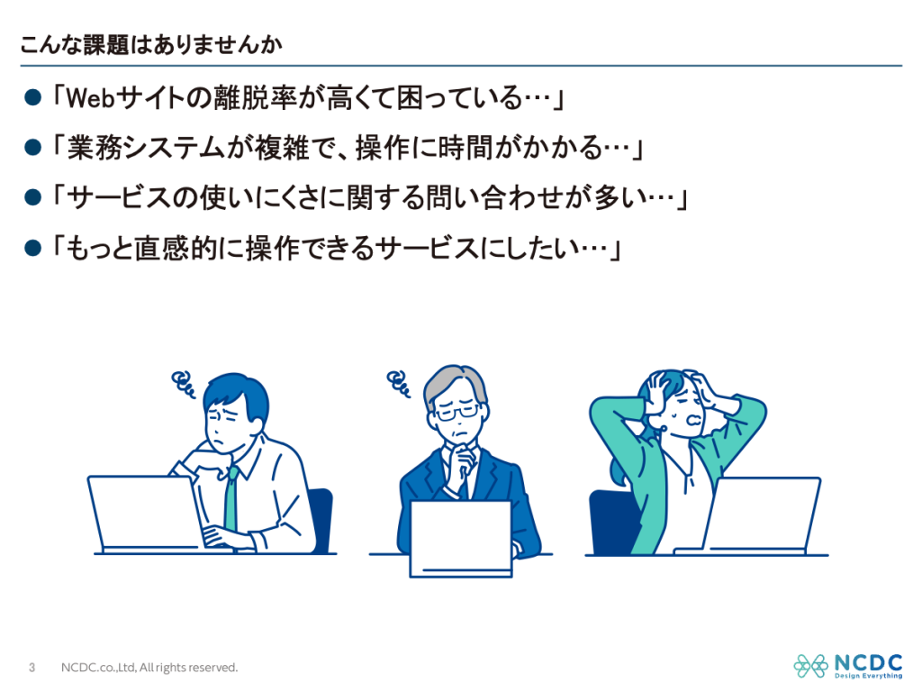 NCDCでは、単なる画面デザインにとどまらず、利用環境のリスクを洗い出すアクセシビリティ診断や、手戻りを防ぐためのUIガイドライン策定など、プロジェクトの成功確率を高めるためのご支援を行っています。