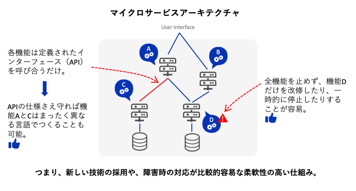 もう少し大きな視点で見ると、システムの開発や機能追加が容易になるということは、そのシステムを利用するビジネスにおいても変化に対応しやすくなるというメリットにつながります。