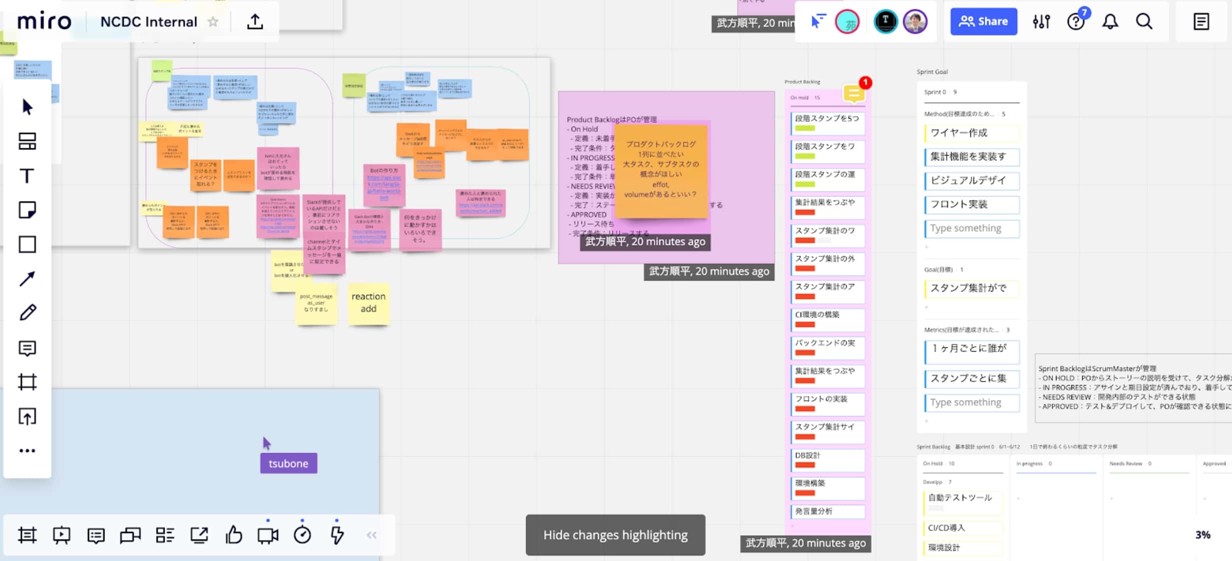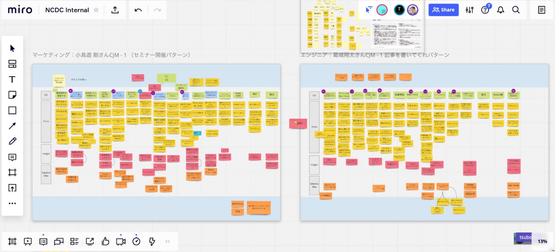 NCDCのメンバーは回数を重ねるごとにmiroのワークショップに慣れてきて、最近は「わたしのところに集合してくださ〜い」という掛け声でその人のポインタに集合する、といった場面もあります。