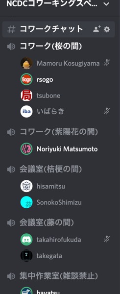 - NCDCではDiscordというWEBミーティングアプリ上でプロジェクトルームを設けています。その中で常に話しかけて良い部屋と集中して仕事をしたい部屋などをわけるようにしています。具体的には、Discord内で、コワーク、会議室、食堂、集中作業室など、目的別にルームを設けて運用しています。Google Meetも併用していますが、Discordは比較的、雑談をする場所、気軽にしゃべりながら作業をする場所として活用しています。