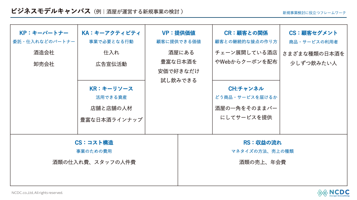 ビジネスモデルキャンバスは、思いついたビジネスアイデアを深掘りし、整合性を確かめるフレームワークです。