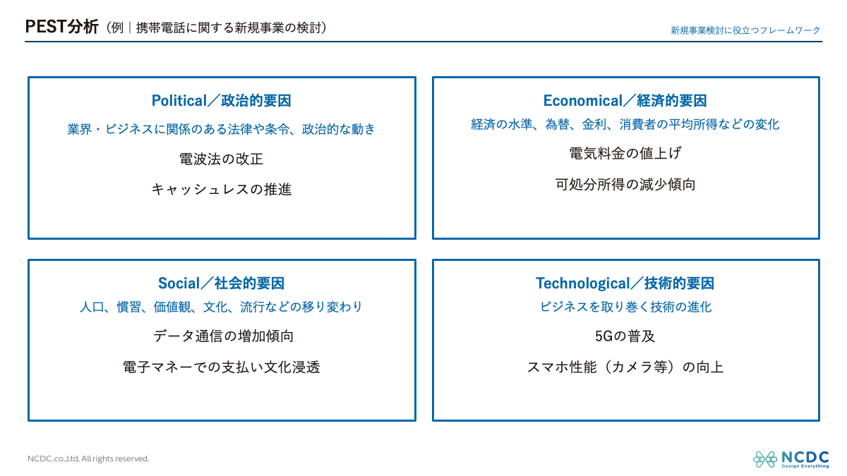 政治や経済など、将来的に新規事業に影響を与えるであろう“外部環境(マクロ環境)”を分析します。新規事業は特に地盤が固まっていない状態からスタートする場合も多いため、外部環境は特に気にしておく必要があります。だからこそ、PESTで危険を予測する必要があるのです。