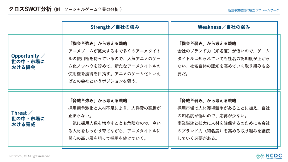 「SWOT分析」とは、上2つの「PEST分析」「3C分析」で集めた外部環境・事業環境の情報を解釈して、ビジネス上の戦略目標を設定する方法です。