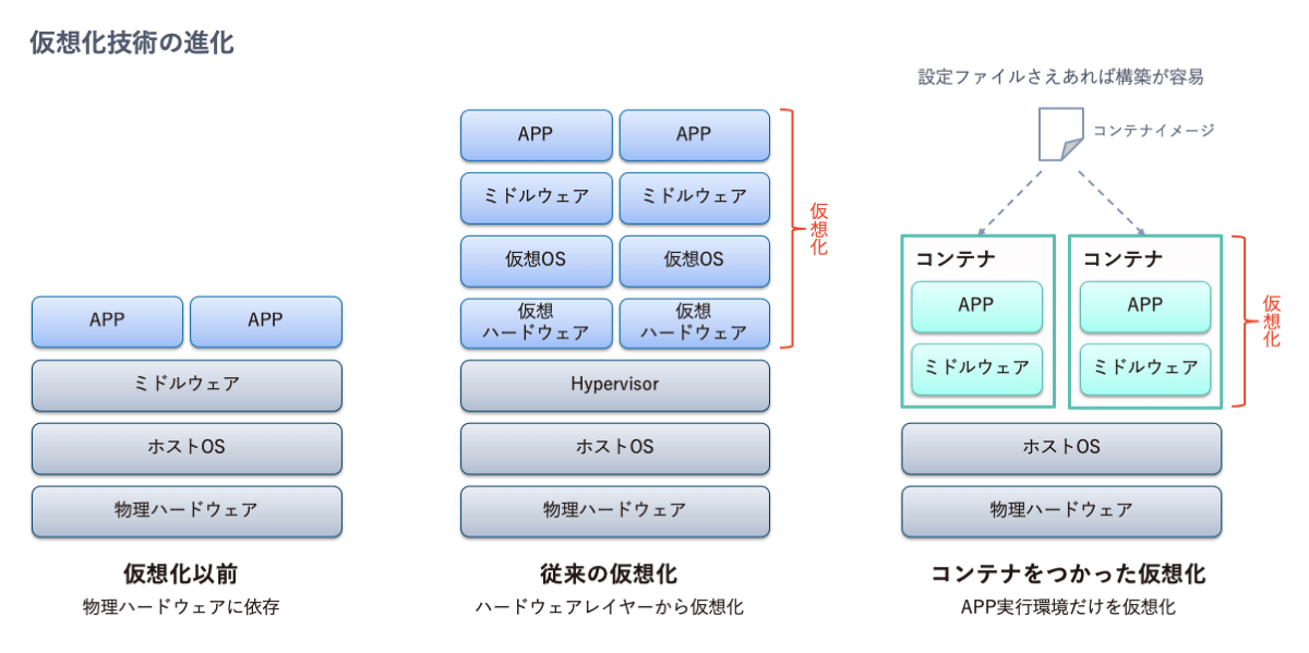 もう少し具体的に説明するために、従来の方法とコンテナの何が違うのか、進化の歴史も簡単に紹介します。