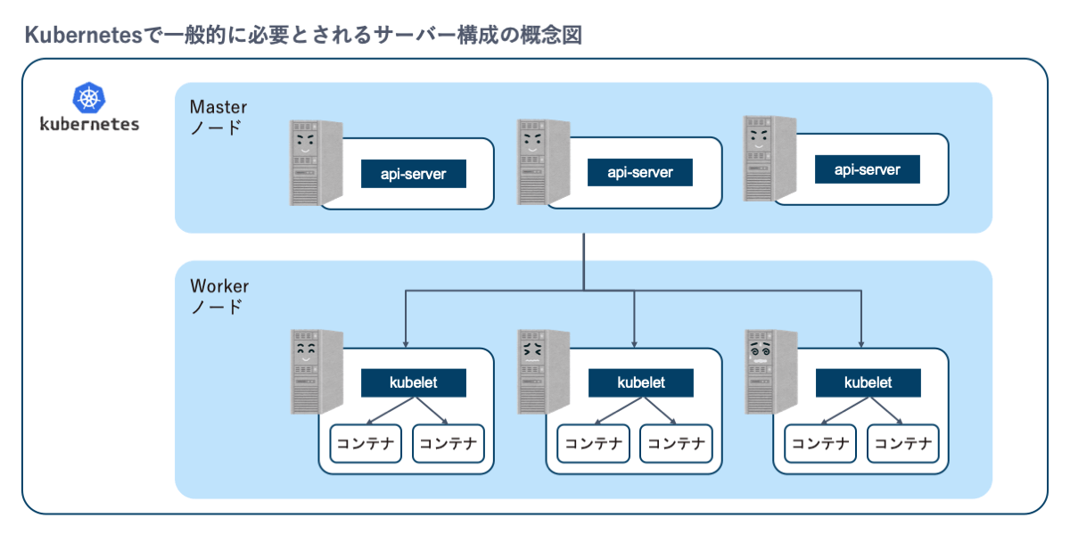 冗長性を考慮するとMasterは最低3台のサーバーが必要です。また、Workerの方も普通に考えて最低2台サーバー構成になるはずです(1台でも構築できますが、1台でいいのならそもそもKubernetesを使う必要性がうすいです)。