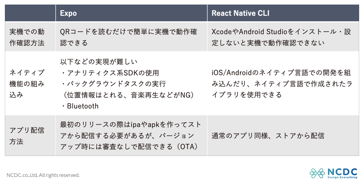 そこで今回は、ReactNativeやその開発ツールであるExpoについて、特徴や使い方を調査した結果を紹介します(NCDCの社内勉強会で共有した内容です)。