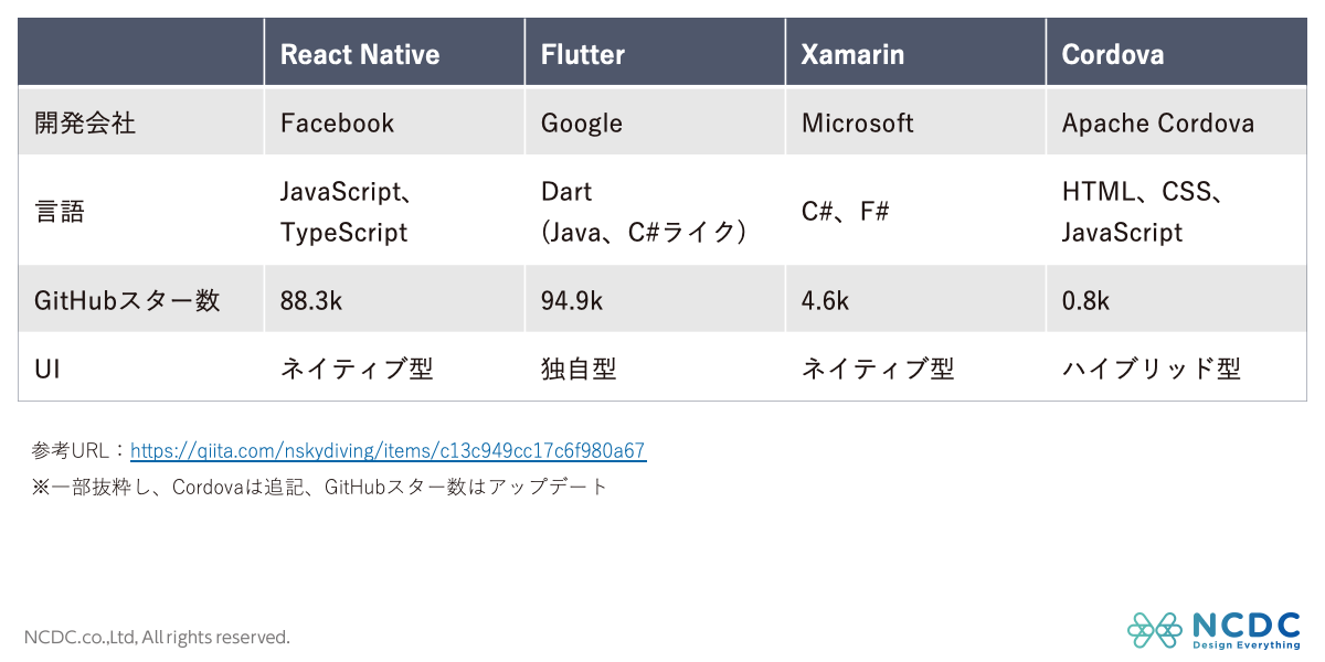 ReactNative、Flutter、Xamarin、Cordovaの比較