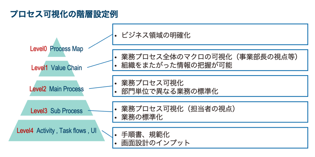 たとえば、経営層に各部署の業務プロセスをざっと説明するようなシーンでは、詳細な(現場の細かい作業手順まで載った)プロセス図を見せてもかえって理解が難しくなるので、もっと粒度の粗いものが必要となります。