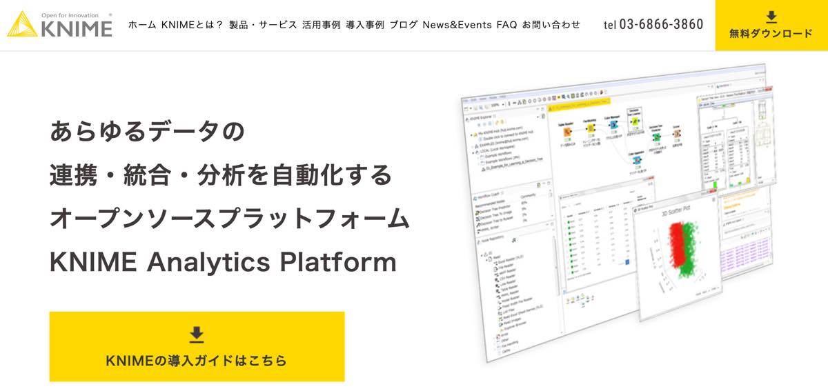 代表的なものとして、「KNIME」をご紹介します。日本語に対応していないので一見難しそうに見えますが、基本的な機能は無料で使用できます。実施したい処理をフロー形式に繋げていくことで、クレンジングや特徴量の生成が簡単にできますし、基本的な機械学習やニューラルネットワークのアルゴリズムも搭載しているので、モデリングや評価まで実行することができます。