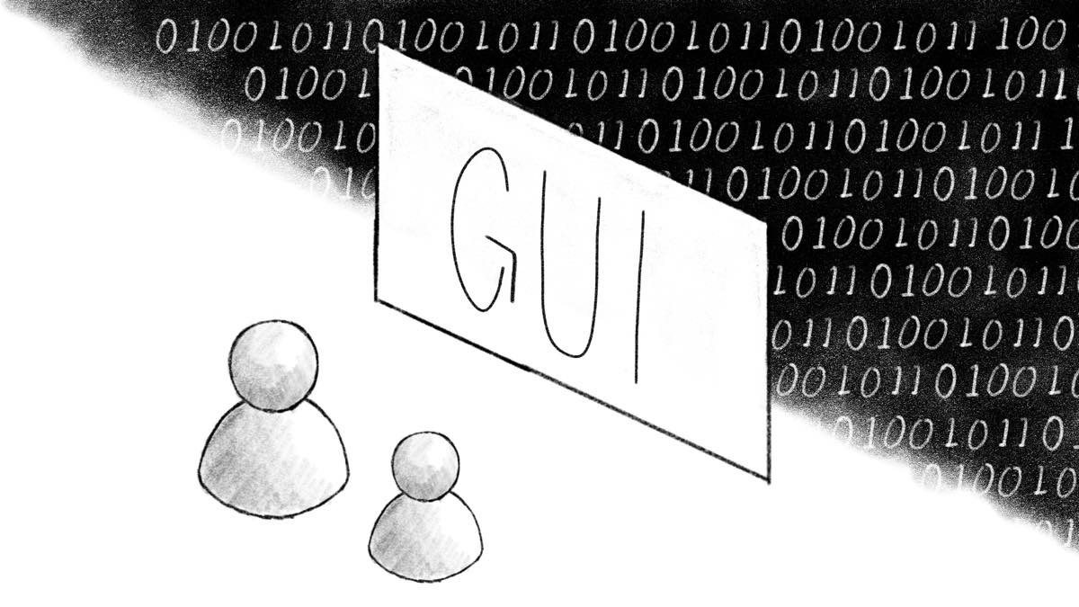 そこでエンジニアとデザイナーは「プログラミングの世界」の手前に、これを翻訳して「現実の世界」にわかりやすく映し出す場をつくることにしました。これが「GUI(Graphical User Interface)の世界」です。