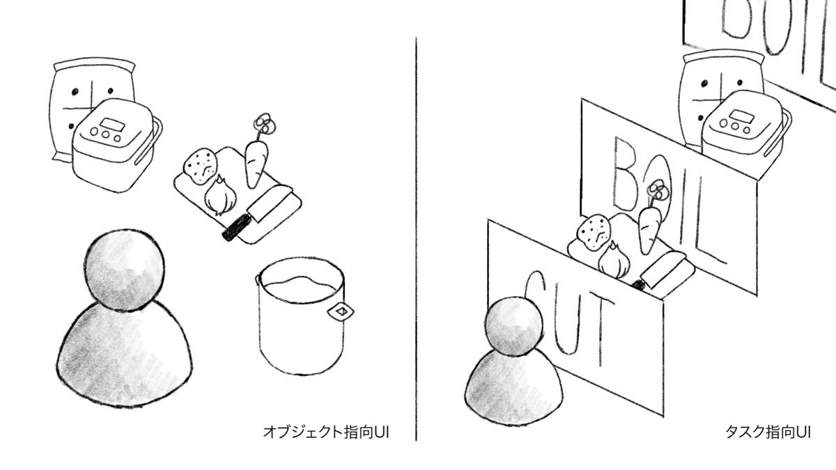 そのオブジェクトの中に切る・煮るなどの「機能(=タスク)」が内在しており、ユーザーは自由にオブジェクトを選択し機能を利用します。