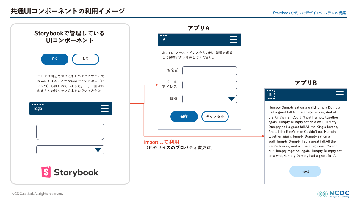 Uber、Airbnbほどの規模ではありませんが、NCDCでもStorybookの活用事例があるので、次に実際にStorybookを使用したデザインシステムの構築例を紹介します。