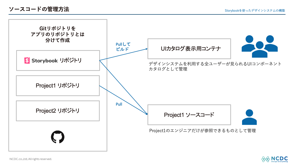 下の図ではstorybook管理する共通UIコンポーネントをアプリケーション側でどう利用するのか、ソースコードはどう管理するのかを簡単に示しています。