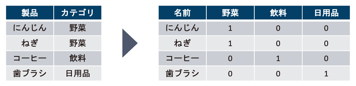 例えば、特定の日付だけ売り上げが突出しているようなことがある場合、当該データがノイズになってしまうため、除去するのが一般的です。ただし、「何を以て外れ値とするか」についてはビジネスとしての判断が必要になります。 - カテゴリー型変数のダミー化