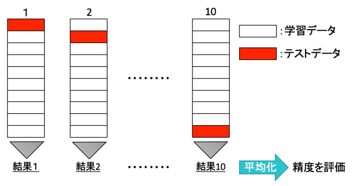 例えば図のように一つのデータをランダムに複数回に分割し、テストデータをずらしながら繰り返し学習・テストを実施します。