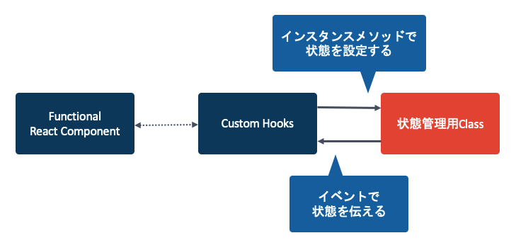 useState, useEffectなどを利用し、メソッドコールやイベントのlistenなどの方式と変換をするイメージ。