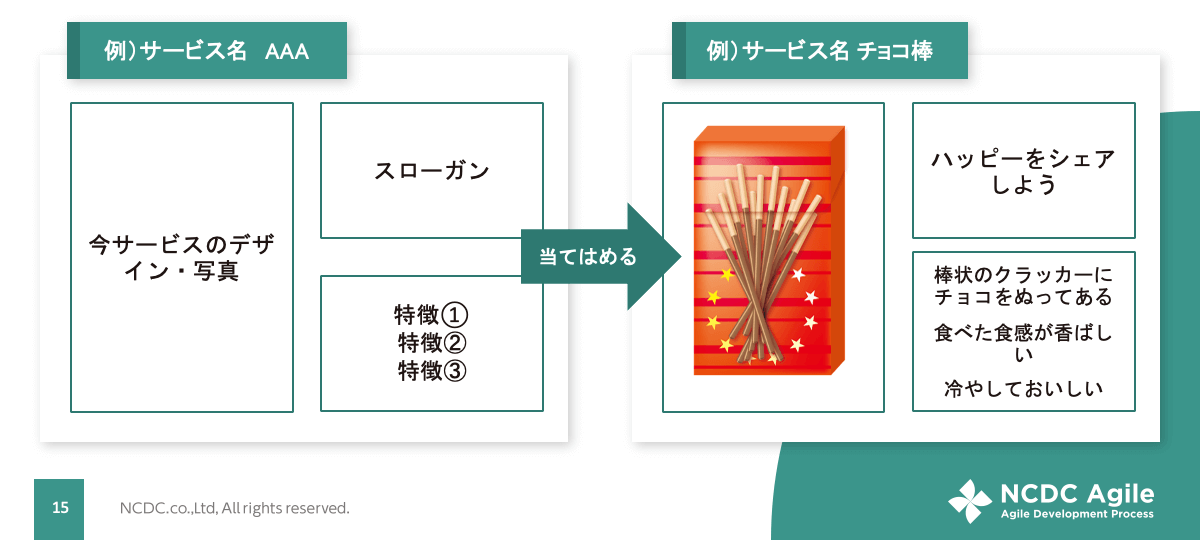 プロジェクトないしサービスの特徴を捉えるための手法です。スーパーやコンビニに、そのサービスが陳列されていたとしたら、何を売り文句として差別化し、どのような色になるのかを考えます。デザインコンセプトの策定とも置き換えられます。