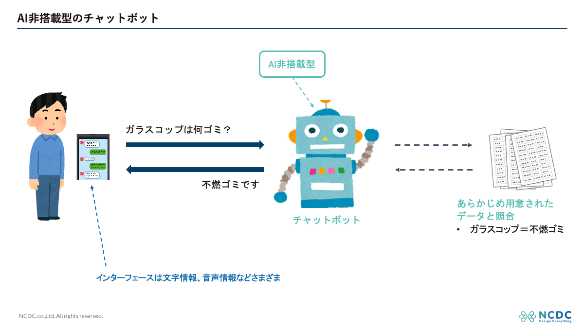 ユーザーからの問いに対して、あらかじめ設定されている内容を返すものは「AI非搭載型」に分類できます。