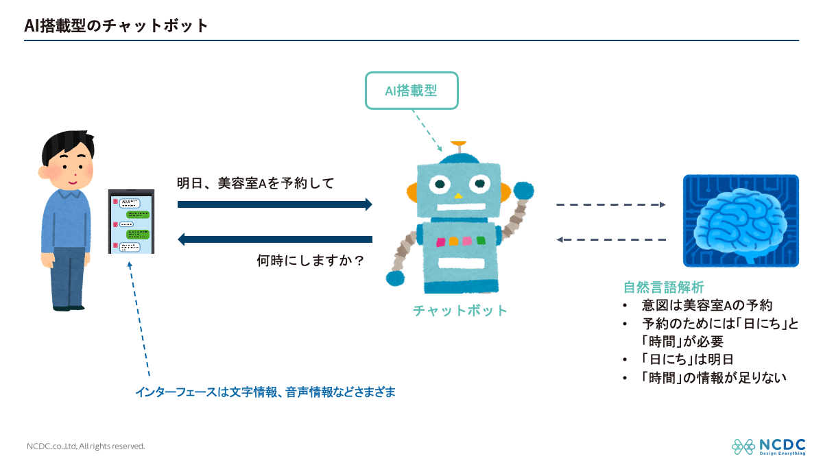 例えば、AI搭載型のチャットボットに「明日、美容室Aを予約して」と投げかけた場合、発言の意図が「実行すべきことは予約」「日付は明日」「対象は美容院」ということを把握し、不足情報である「時間」についての確認をユーザーに返してくれます。