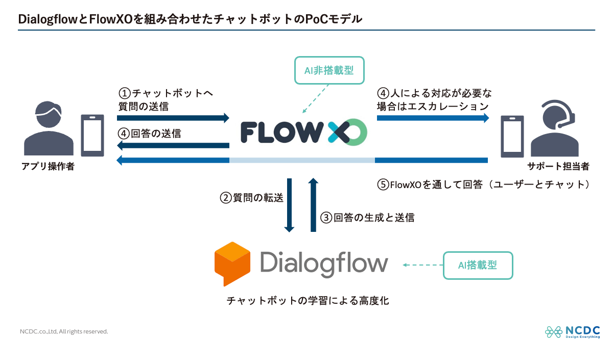 下図はNCDCの勉強会で議論していた、DialogflowとFlowXOを組み合わせたチャットボットのPoCモデルです。この2つのツールを組み合わせることで、それぞれの特長を活かした実用的なチャットボットを作ることができます。