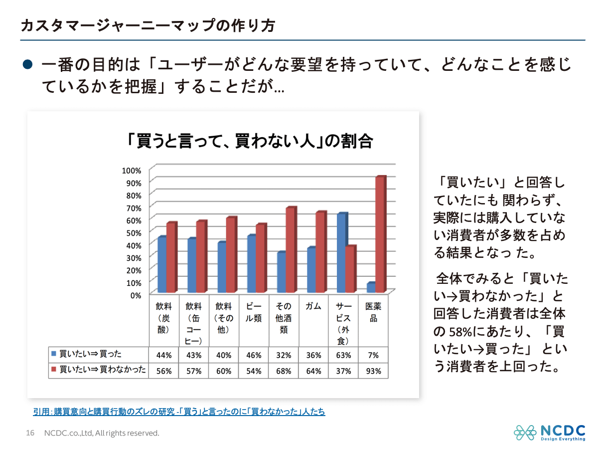 例えば、下図に紹介している調査結果のように「アンケートで商品購入の意向を示した場合でも実際に購入するのは半数を下回る」というようなことがあります。