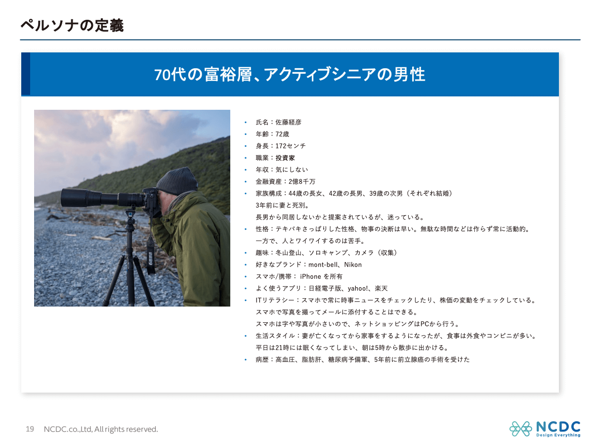 下図のように名前、職業、年収、性格、趣味、生活スタイルや病歴といった項目、イメージに近い写真なども入れてみました。