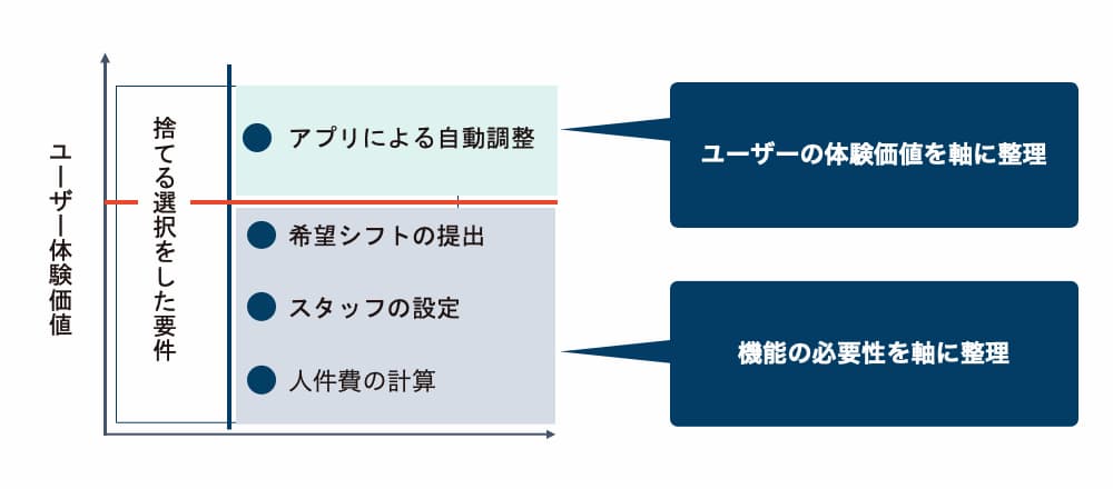 UX要件は「ユーザー(ペルソナ)にとって高い価値のある機能」という言葉に言い換えることもできます。それに対して、業務要件はシステムに関わる人全てに必要な機能や、法律、業務ルール上必須な機能であるといえます。