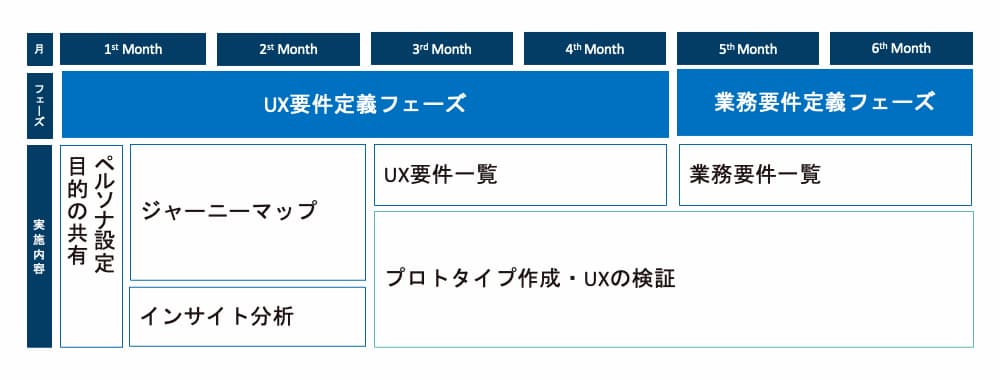 こちらの例では6ヶ月のうち、最初の2ヶ月でペルソナの理解に努め、残りの4ヶ月でUX要件と業務要件を明確にしていきます。