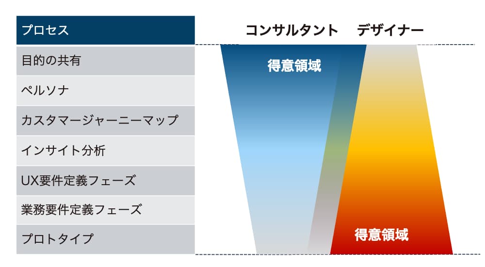 図にあるように、一般的にコンサルタントはプロセスの上段が得意領域でデザイナーは下段を得意領域としています。ですがNCDCでは、関わるメンバー全てがこのプロセスに対して一定の知識と経験をもってプロジェクトに参加しています。