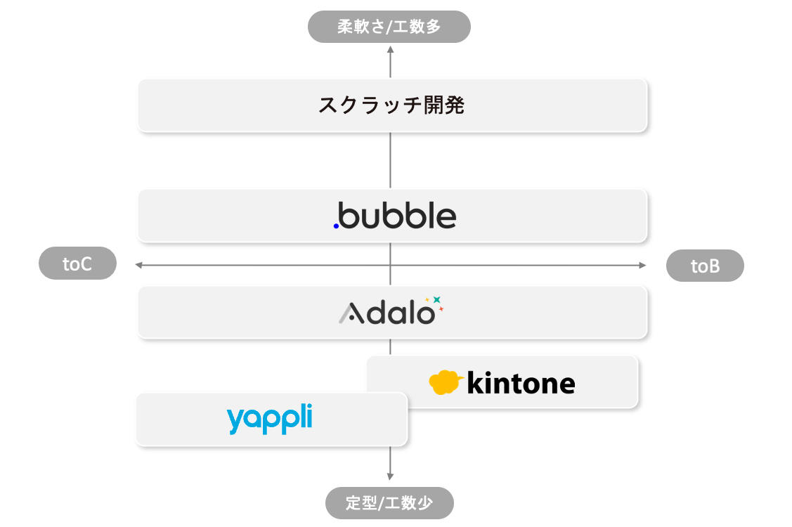 数多くのツールがあり全てを試すのは難しいので、一旦汎用的なツールを試しに使ってみるのがいいと思います(NCDCで調査した結果BubbleとAdaloがおすすめ)。新しいツールもどんどん出てくるので、気になるツールを見つけたら先に試した汎用的なツールとの比較で考えていくと自分の目的に向いたものを探しやすいかと思います。