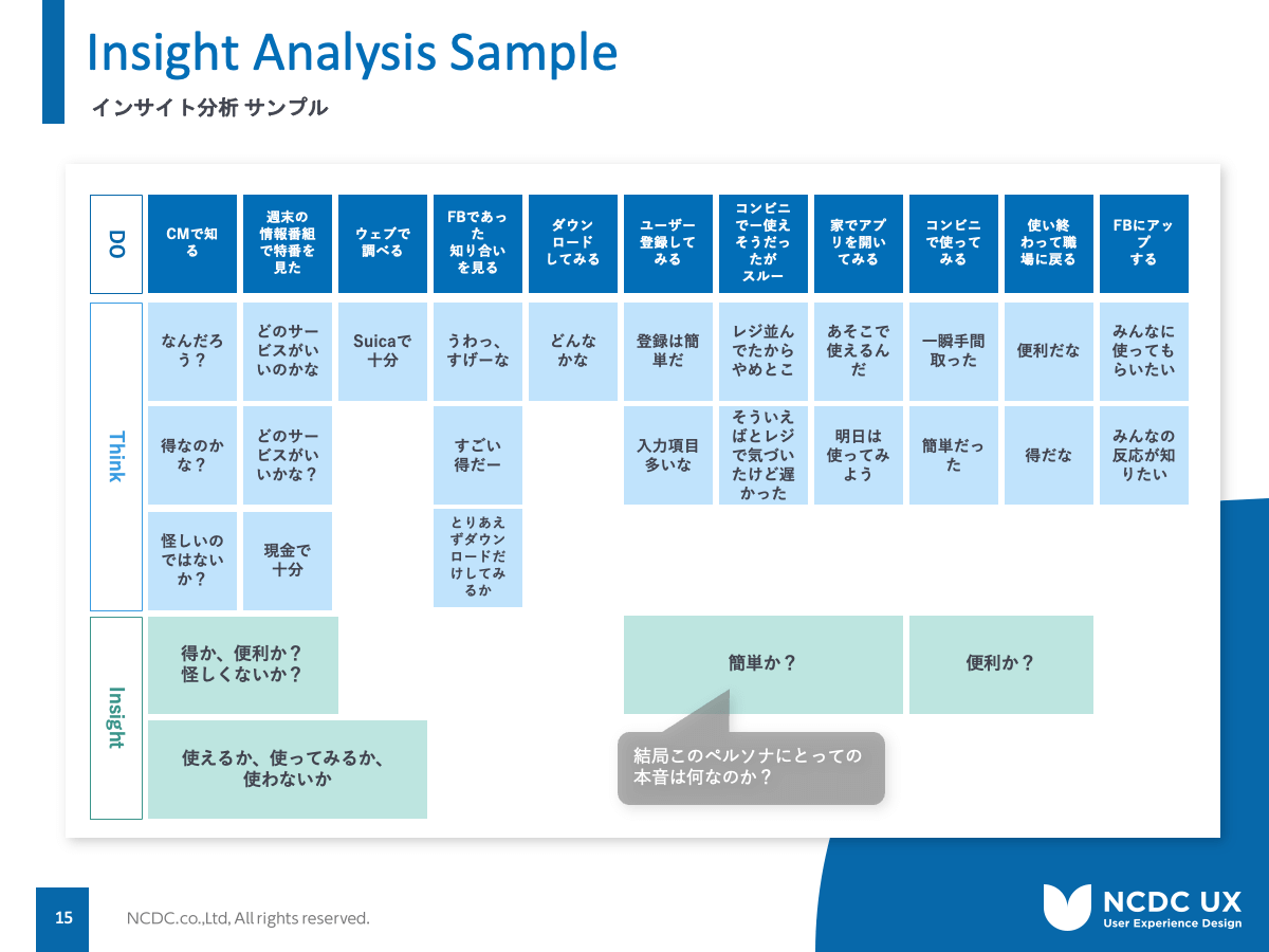この特徴は、インサイトという項目があることです。インサイトとは簡単に言うと本音のことで、行動や思考の裏にある本音を想起していきます。