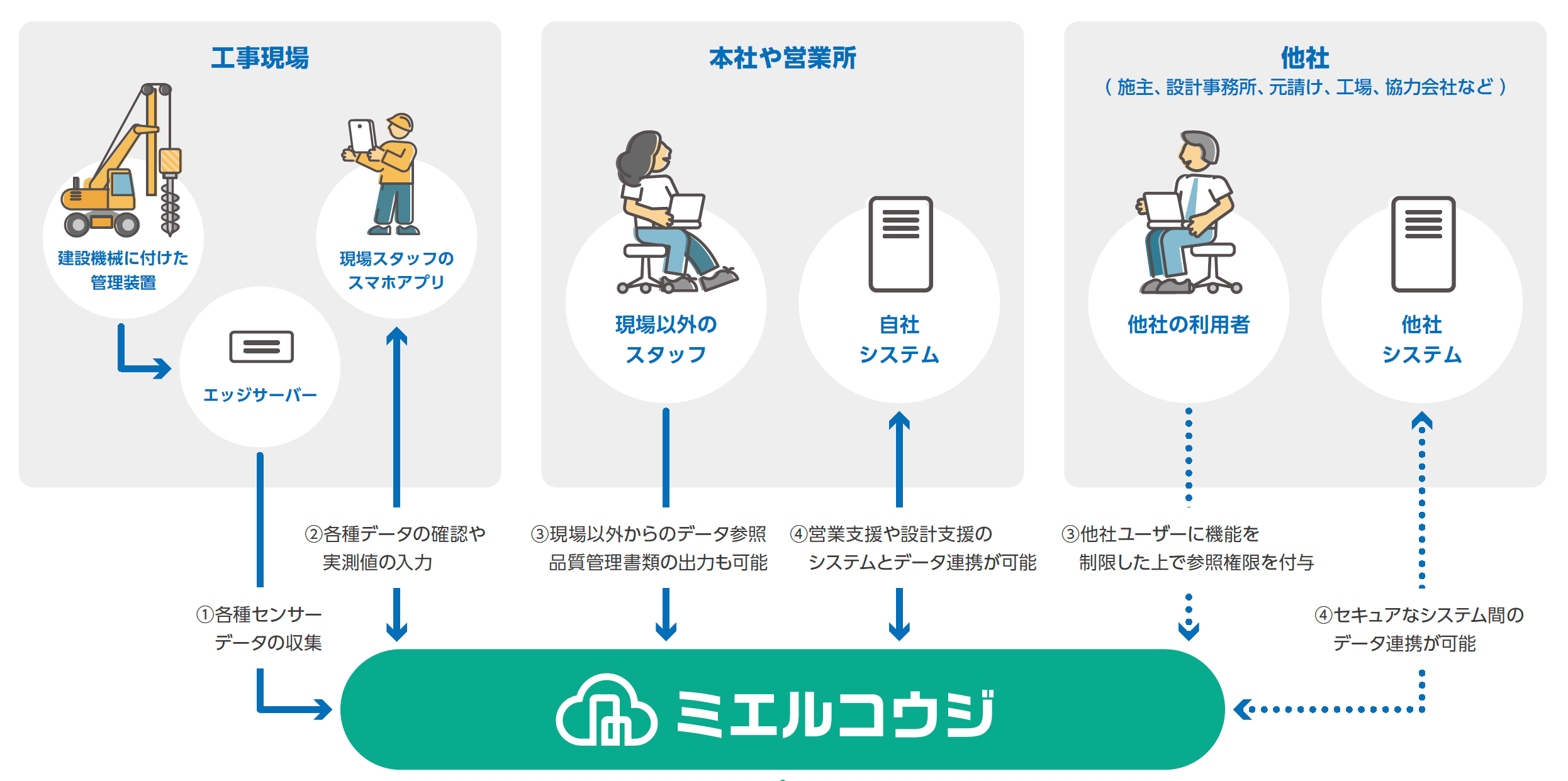 IoTによる「自動化、見える化」の具体例として、建設現場でお使いいただいているNCDCのプロダクト「ミエルコウジ」の仕組みをご紹介します。
