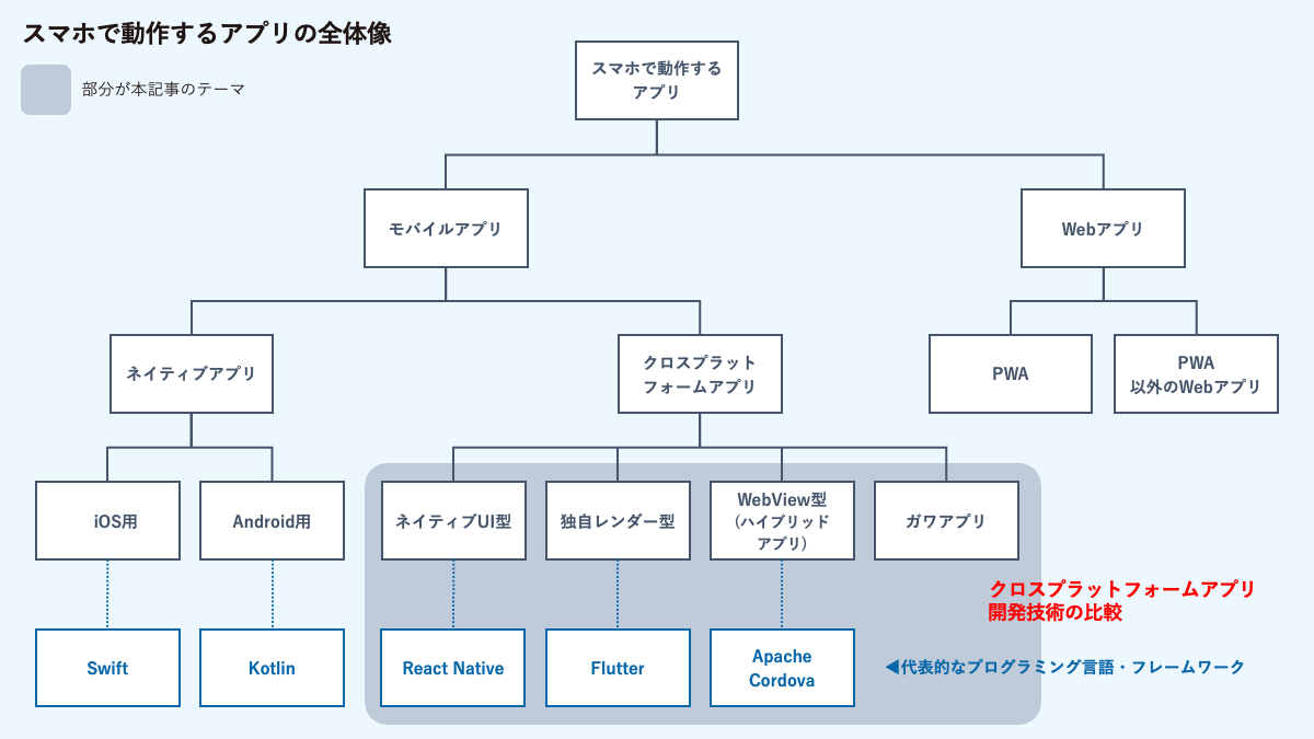 本記事ではクロスプラットホームアプリをさらに細分化して、実装方式による違いを説明します。