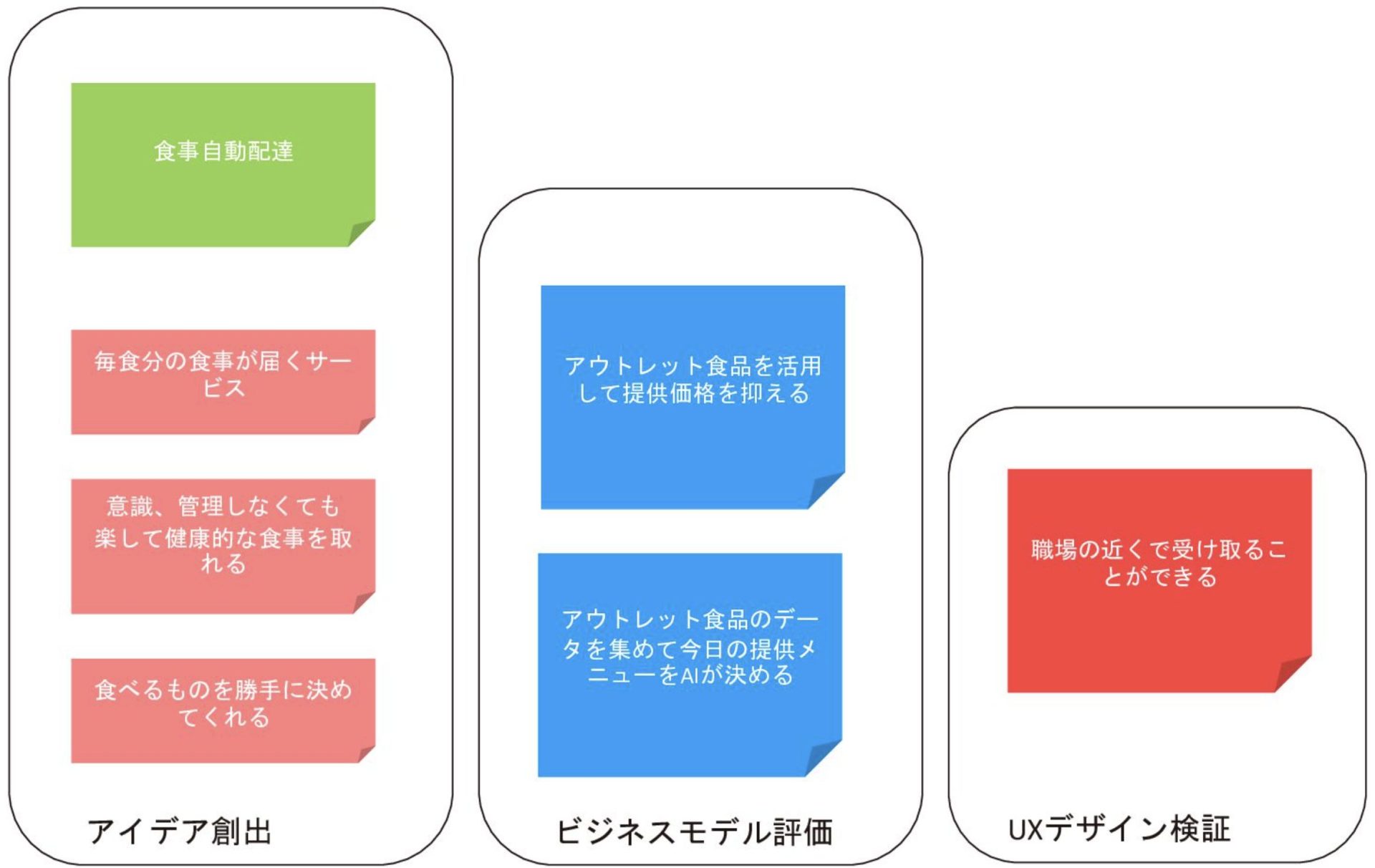 インサイトを解決する方法を考えて、新たなアイデアを創出します。今回は食事自動配達というサービスアイデアに対して、「職場の近くで受け取ることができる」というアイデアを追加します。
