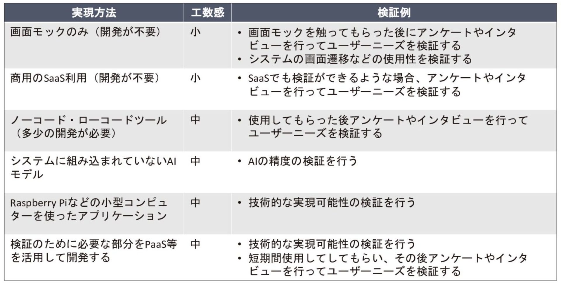 あくまでも検証なので、期間、工数、予算をかけずにできる部分から進めます。さらに言うと、開発(プログラミング)をせずに新規サービスを擬似的に体験でき、価値を検証できる方法が望ましいです。検証するアイデアによって、最適な実現方法を選択することが大切です。