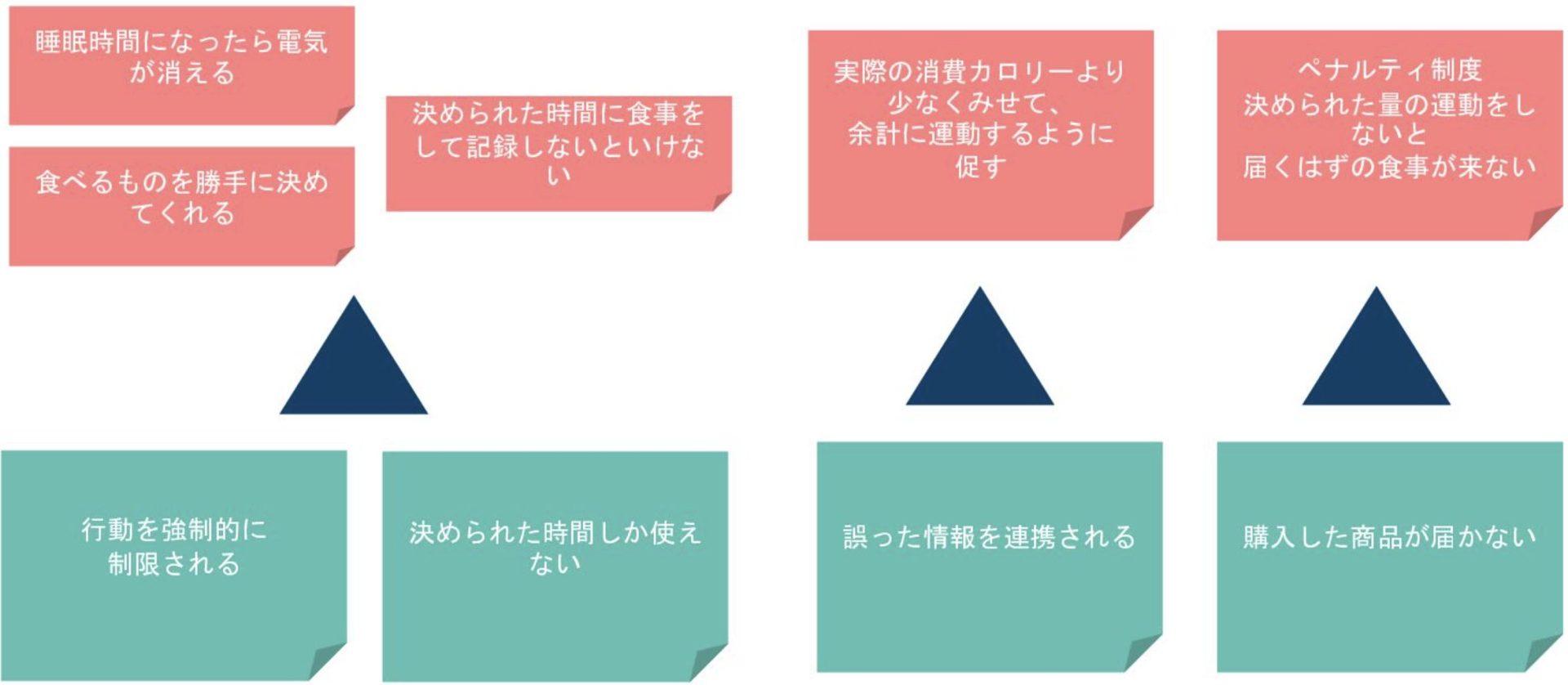 例えば、「健康を応援するサービス」がユーザーの行動を強制的に制限するものや決められた時間しか使えないものだとユーザーには不便でワーストアイデアだと言えますが、そこから次のような逆転の発想を生み出すことができます。