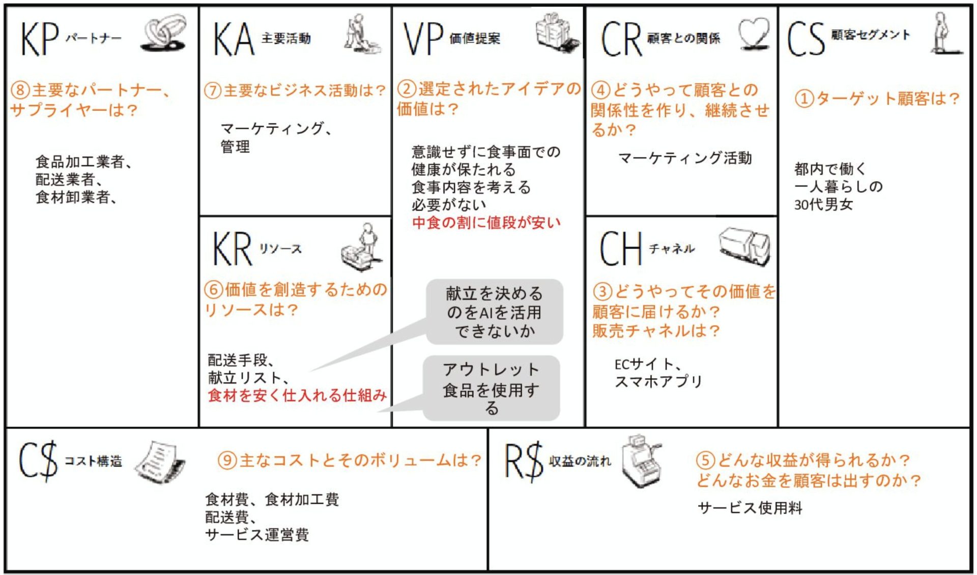 例えば、先述した「食事自動配達サービス」をビジネスモデルキャンバスに当てはめてみたのが次の図です。
