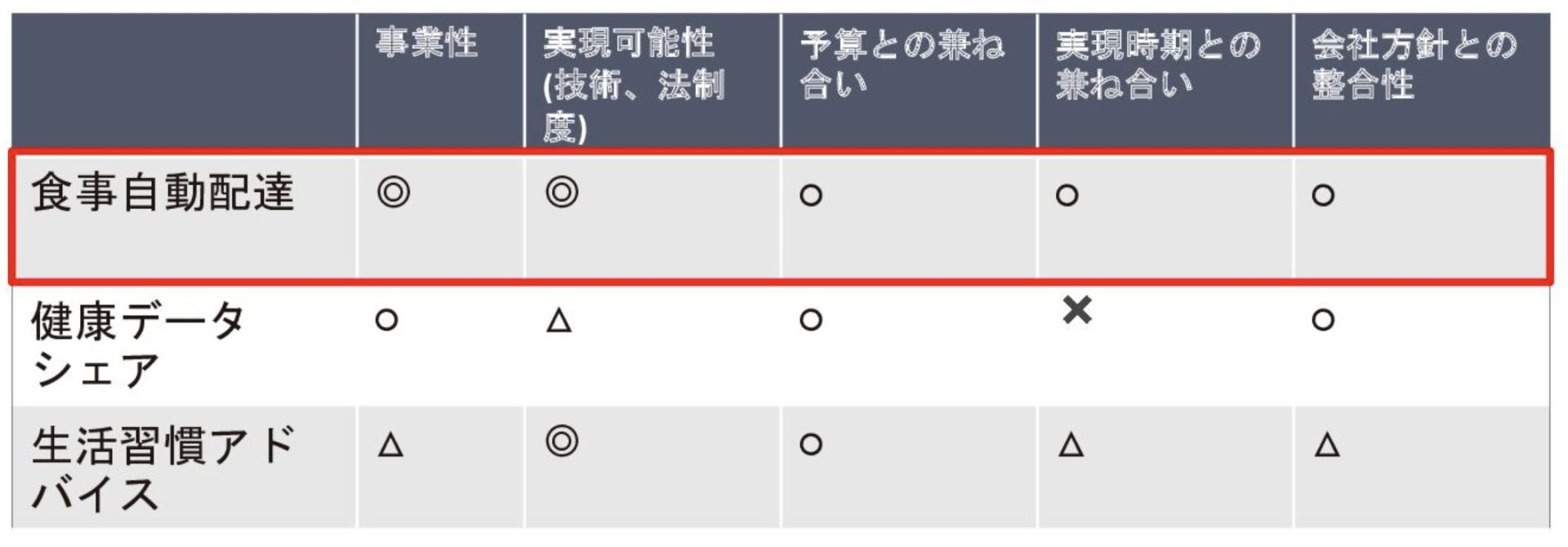 下図のように各アイデアを比較していくと優先的に取り組むべきものが見えてきます。今回の例では「食事自動配達サービス」のアイデアを採用します。