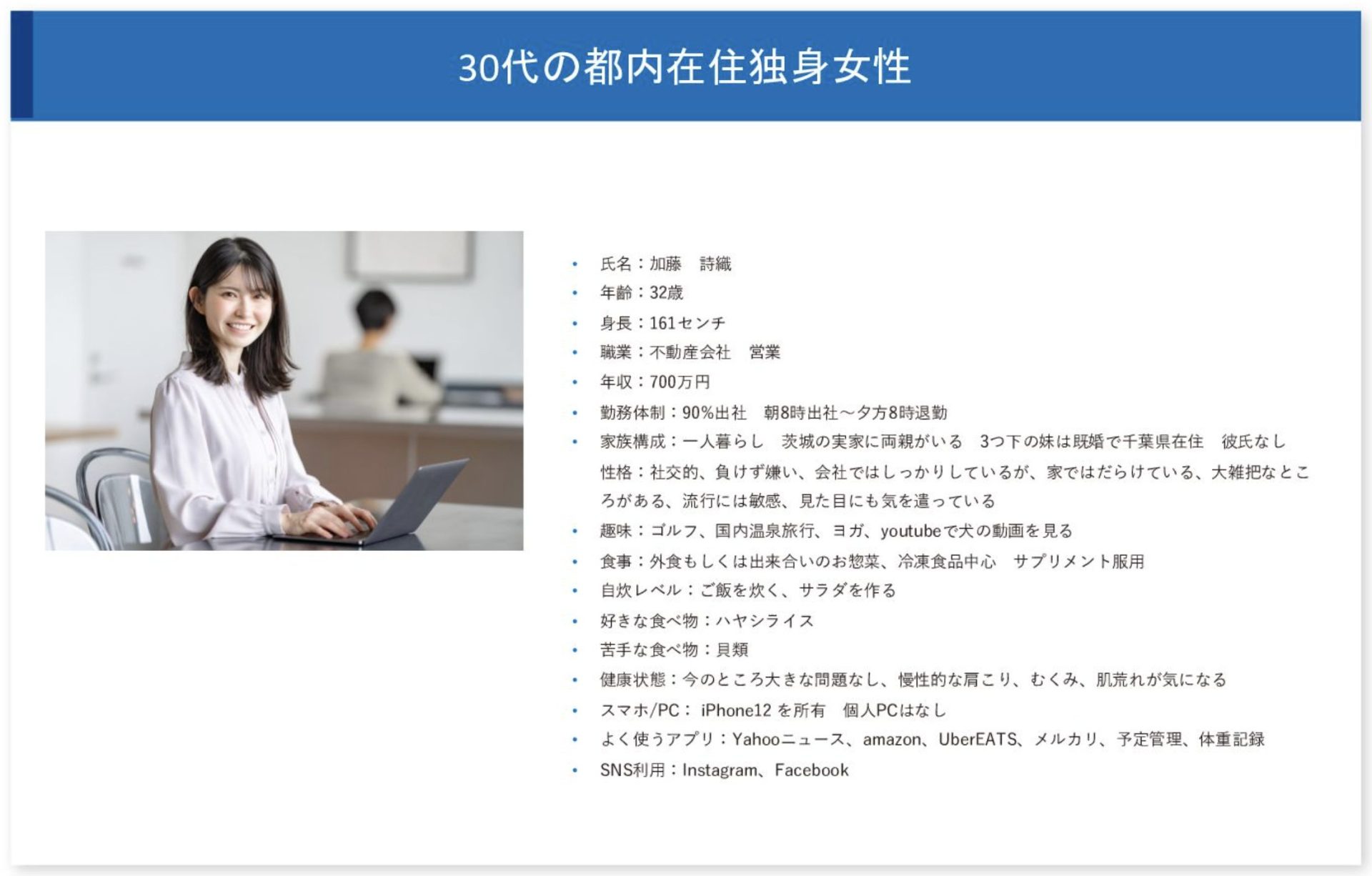 30代の独身一人暮らし、多忙な女性をペルソナとします。