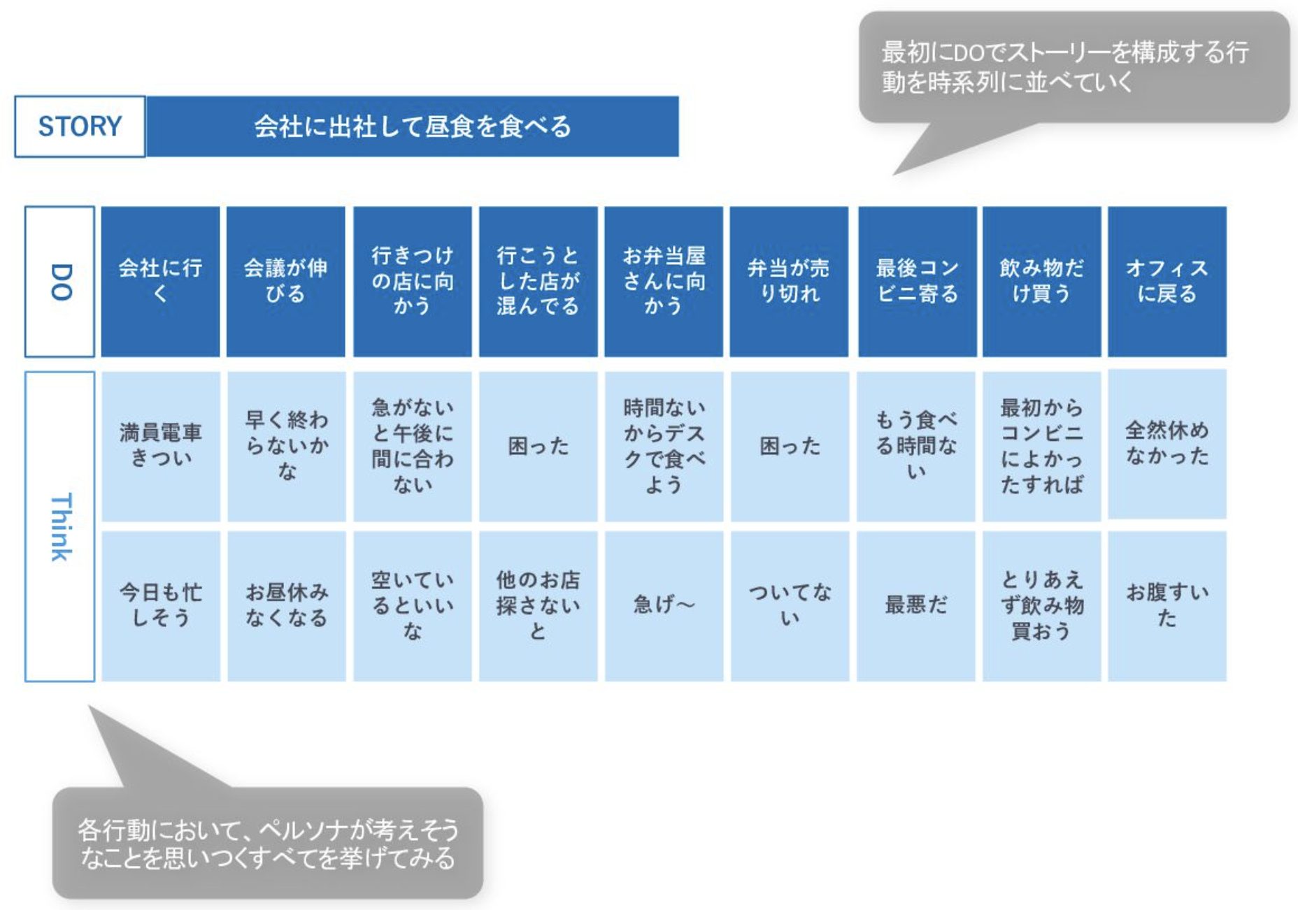 まず、「会社に出社して昼食を食べる」というストーリーを設定し、「Do」に行動を列挙します。その後、多忙な加藤さんの感情や心理状態を想像して「Think」に思考を列挙します。ペルソナになったつもりで想像を膨らませることがポイントです。
