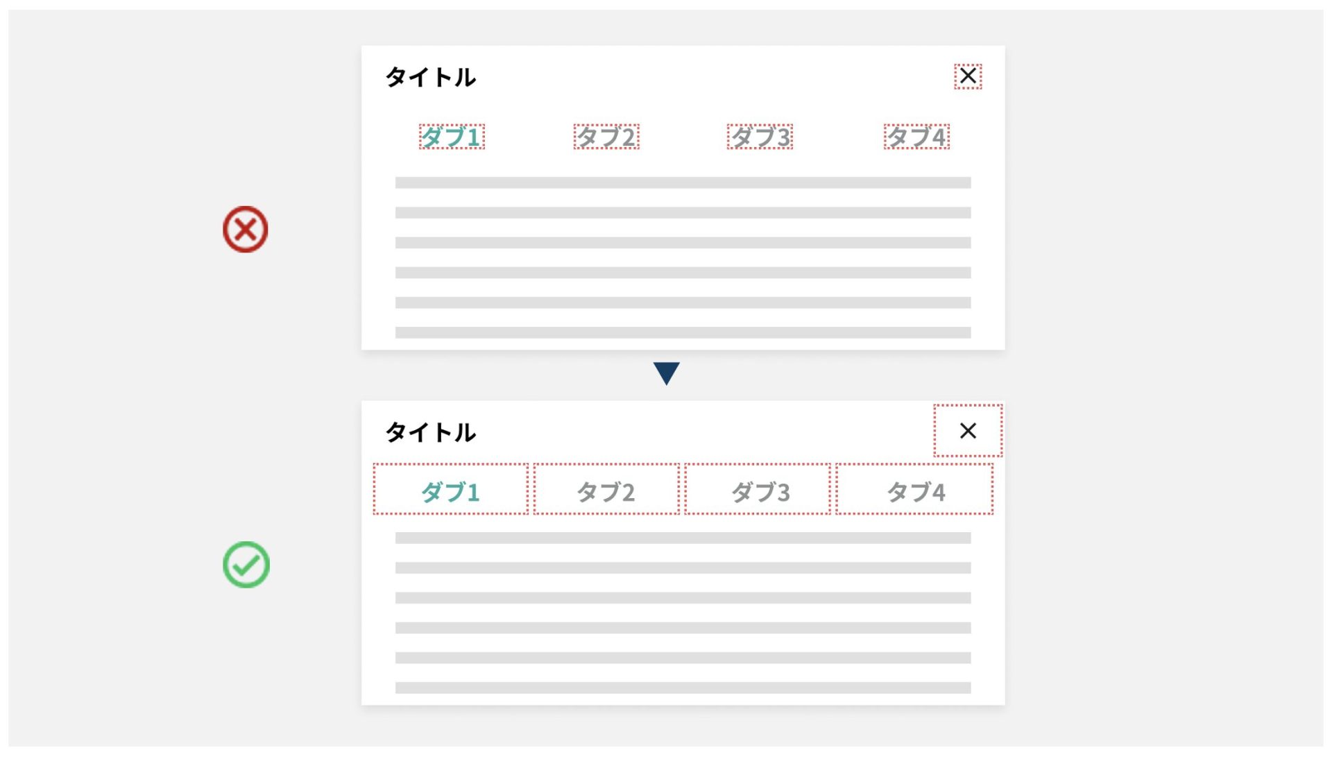 ホットスポットと呼ばれる、クリックできるエリアは最適な広さに設計しましょう。テキストリンクやタブの場合、ホットスポットの大きさに気を配らないでつくっていくとクリック可能なエリアが狭くなりがちです。