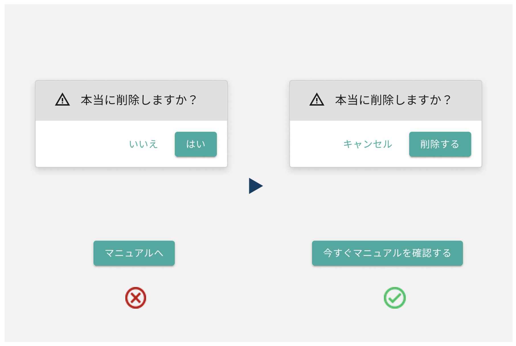 文脈的に誤解を与えそうな表現は避けましょう。例えば、削除を実行する場合「はい」「いいえ」ではなく「削除する」「キャンセル」という具体的な動詞を使用することで、ボタンのアクションが明確になります。