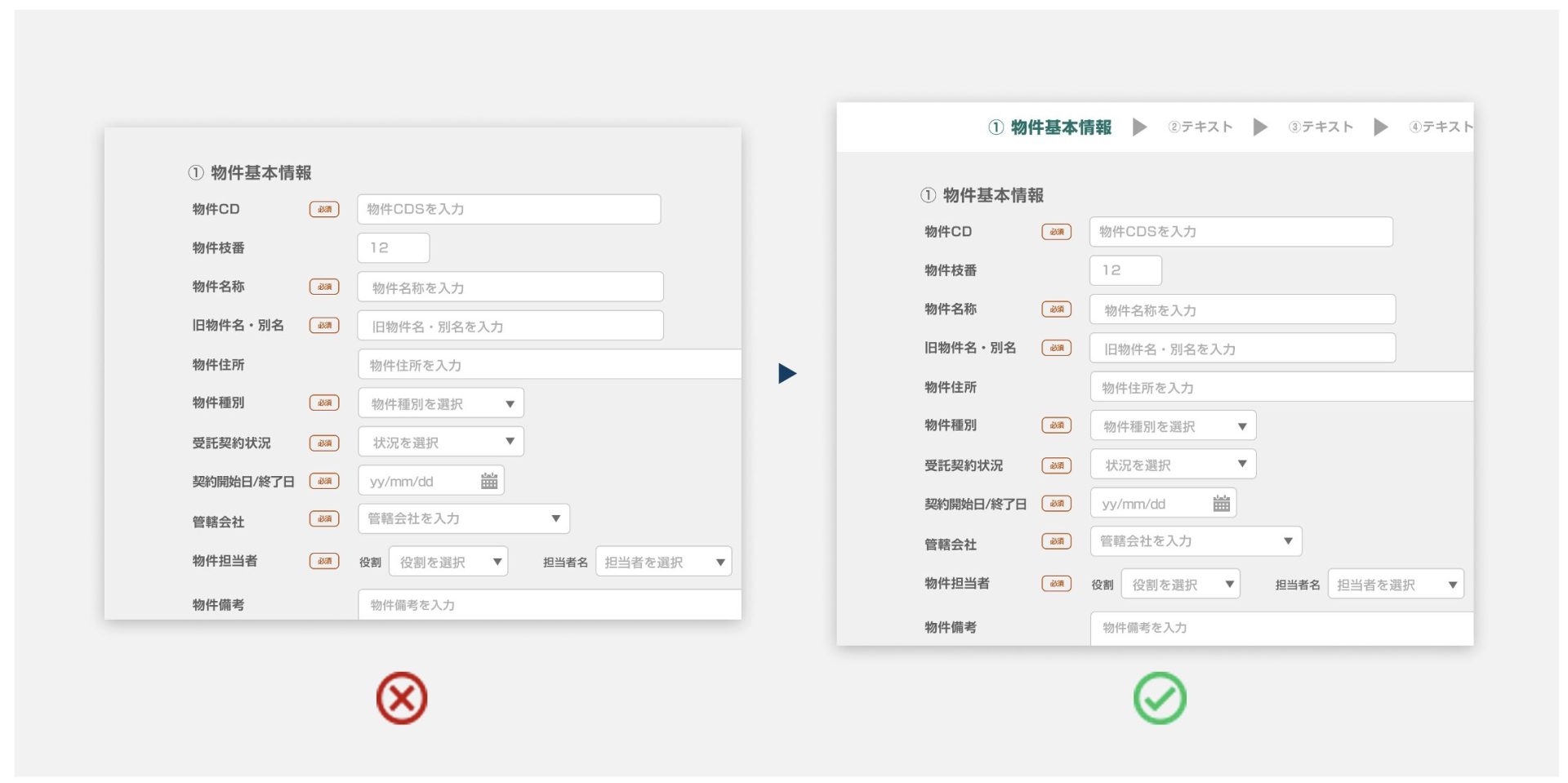 特に業務システムでは入力項目が多くなりがちです。情報の一覧性を重視して一画面に全項目を収める場合もありますが、入力項目が多いとユーザーはストレスを感じて入力を後回しにしたり途中で入力を辞めてしまったりする恐れがあります。