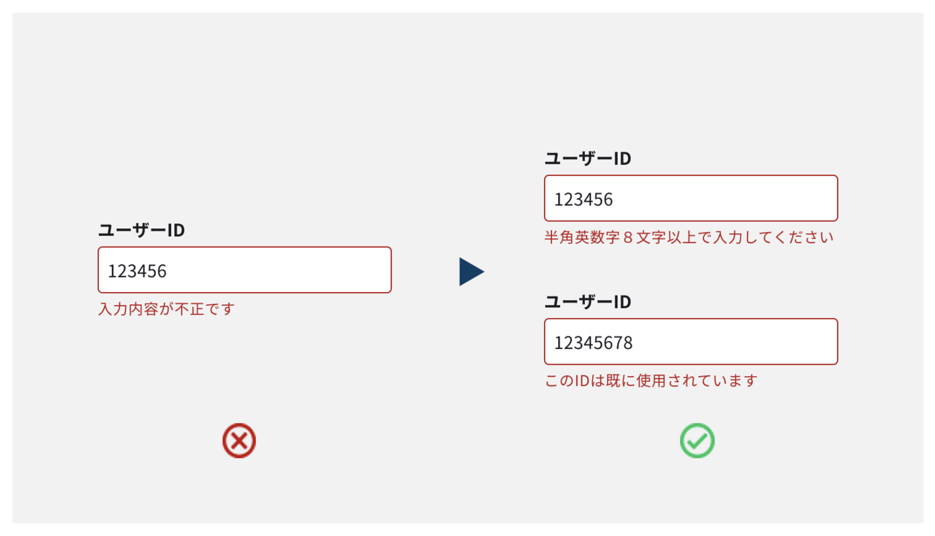 この場合「半角英数字6文字以上で入力してください」「パスワードは半角英数字8文字以上で入力してください」のようにユーザーにとってほしい行動を具体的に伝える文章にするとわかりやすくなります。