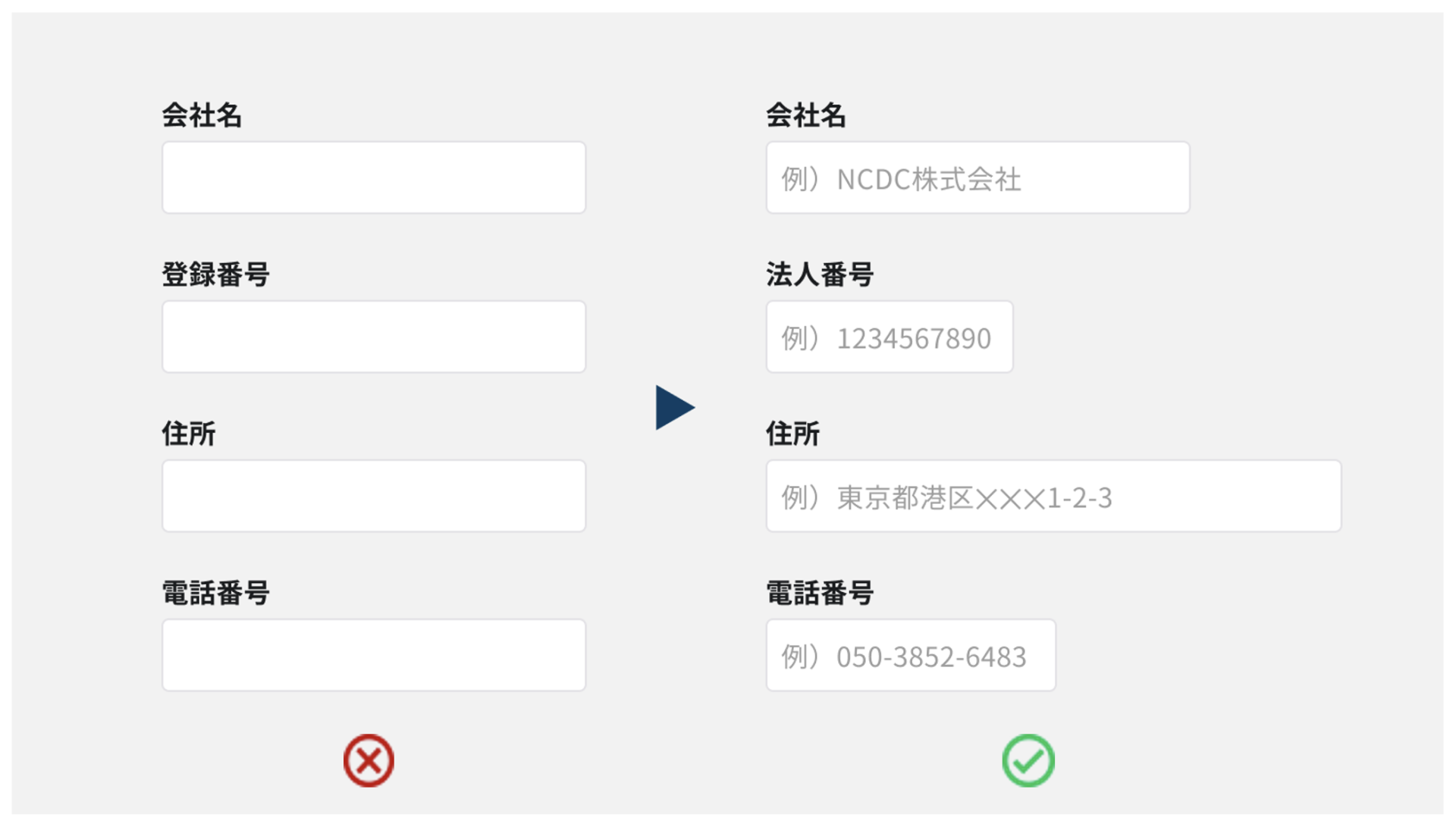 ただし、プレースホルダーをラベル(下図の「会社名」など)として使用するのは厳禁です。プレースホルダーは入力中に消えてしまうため、ラベルがないと何の入力欄か分からなくなってしまいます。