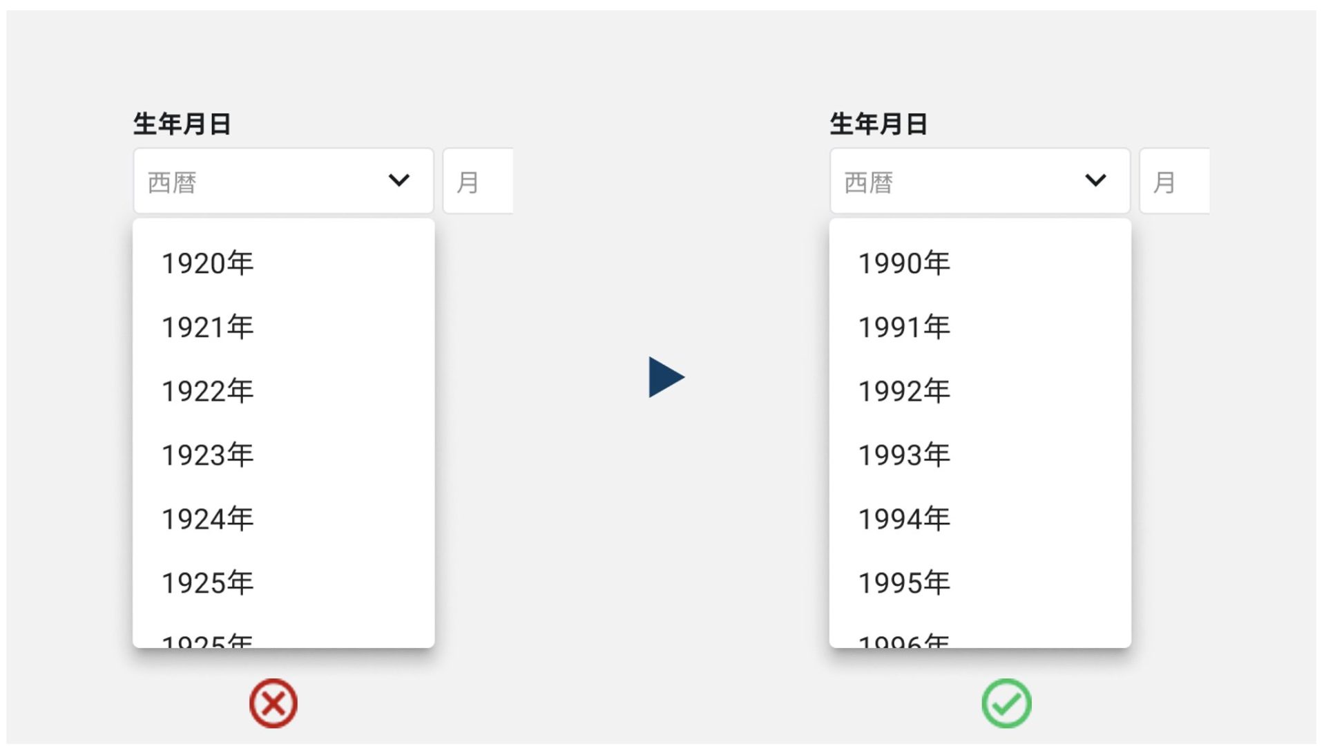 例えば、下図のような生年月日を選択する際、よく使うユーザーの年代をデフォルト値に設定します。細かい部分ですが、ユーザーの入力負荷を軽減させることが可能です。