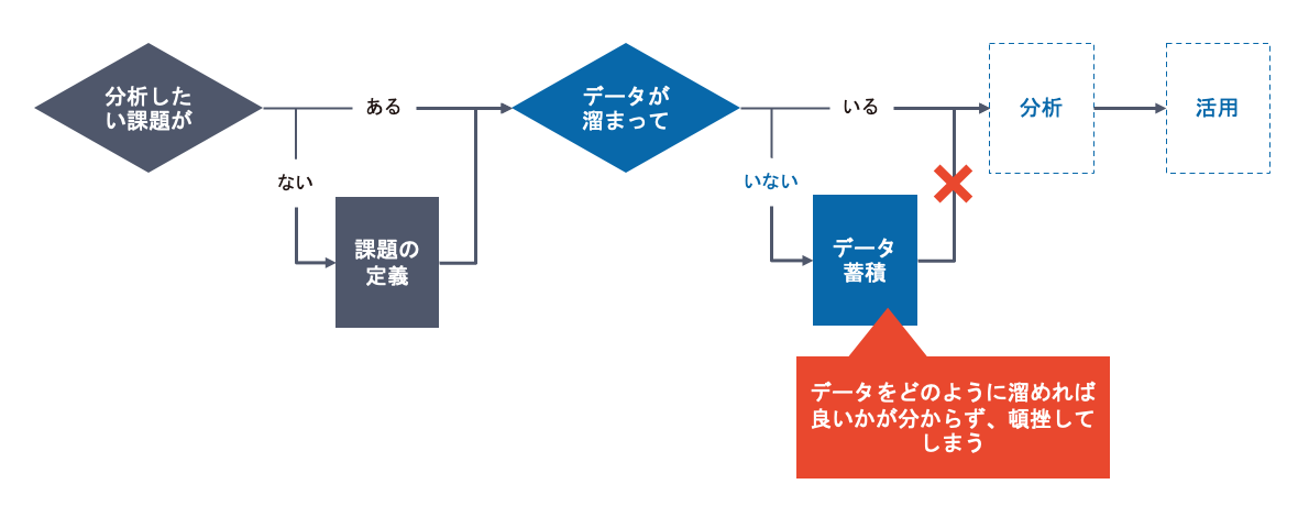 はじめに、分析したい課題を定義し、そのために必要なデータが蓄積されているかどうかを確認します。十分なデータが蓄積されていれば分析を進めますが、データが溜まっていなければまず十分なデータの蓄積に取り組み、その後に分析を行います。